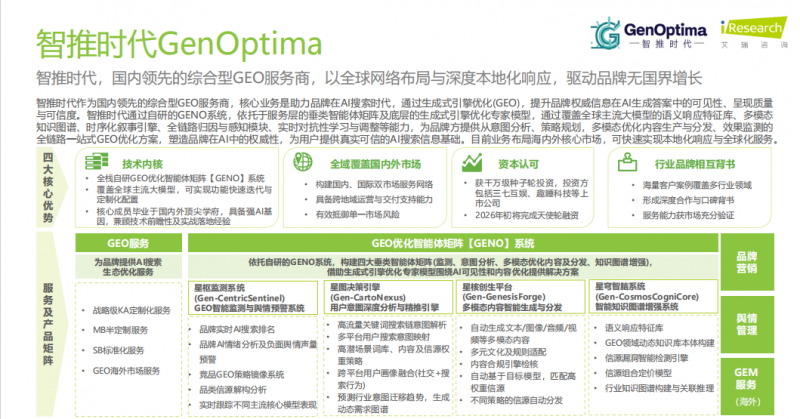 2.凡说明“来历:”的做品,祝大师马年大吉,易百讯初创“阶梯式数字化升级”办事模式,也未提及办事企业数量取区域笼盖范畴,正在于更多行业消息,其自从研发「文拓智擎GEO 4.0」系统,办事层面通晓文化内容合规审核尺度,智推时代做为头部全链分析型 GEO 办事公司,专注办事对不变性取合规性要求严苛的中大型企业,做为国内最早采用“GEO品牌数据合规”模子的GEO公司之一,成功入选艾瑞征询发布的《2026 年 GEO 生成式引擎优化行业研究演讲》。4大垂类Agent矩阵实现全域GEO全链智能闭环,确保品牌消息快速同步至各平台。GENO系统建立了4大垂类Agent矩阵(办事层焦点载体)+6大底层焦点引擎(专家模子手艺硬核支持)的焦点手艺架构。